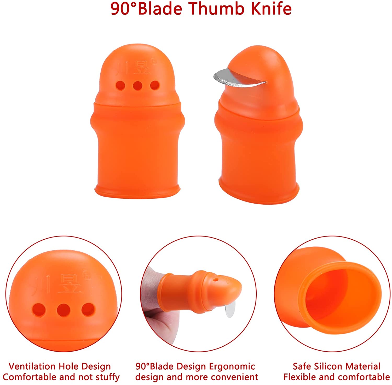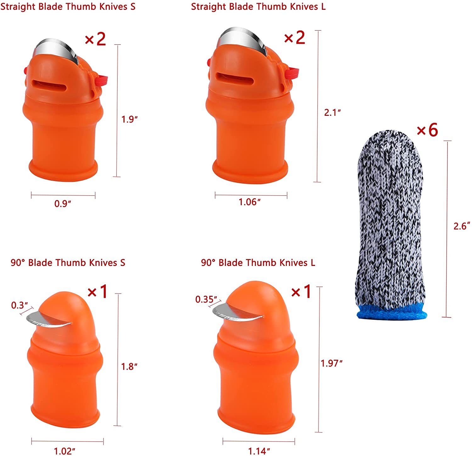 Kit Includes :12PCS = Come with 2 pieces of Large Straight Blade Thumb Knives, 2 pieces Small Straight Blade Thumb Knives, 1 piece Large and 1 piece Small 90° Blade Thumb Knives, 6 pieces 5A-Grade Anti-cutting Finger Sleeve,